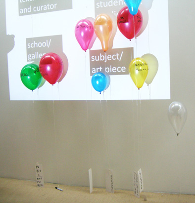 El primer día nos centramos en el tema de las desigualdades y similitudes entre ambas figuras profesionales para llegar a la conclusión de que hay muchas mas cosas en común que diferencias y que todos somos PRODUCTORES CULTURALES. Ha sido una de nuestras preocupaciones utilizar el arte como formato pedagógico por lo que empezamos utilizando como detonante la tarjeta de identificación que diseñamos y en la que pedimos a los estudiantes que se definieran como artistas o profes y globos rellenos de helio como soporte de visualización de las conclusiones a las que llegaron.