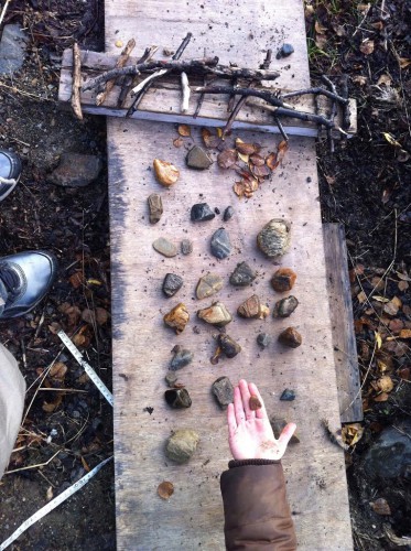 El primero que hicimos fue una Tienda de piedras cerca del pueblo sami deKoutokeino. Seleccionamos las más interesantes que teníamos a nuestro alrededor dependiendo de su color y su textura, y las colocamos muy separadas unas de otras para trabajar la composición, la figura retórica de repetición y ver que mensajes tan diferentes transmitíamos si en vez de juntarlas las separábamos. También trabajamos los números ya que yo hice de compradora y ellas de vendedoras. Luego las tiramos al lago cercano y vimos como se alejaban las ondas.