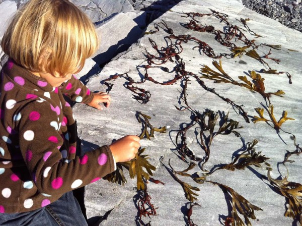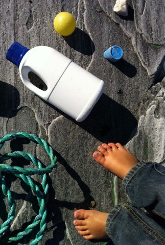 Al día siguiente, en la isla de Soroya sucedió el taller Me gusta/No me gusta con los tesoros (o no) que encontramos en una playa maravillosa. En No me gusta pusimos todo aquello que NO queríamos encontrar en una playa y en Me gusta Paz cubrió una piedra con un tapiz de algas. Otra vez comentamos los temas del color y en especial la diferencia entre la textura artificial y orgánica.