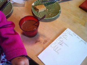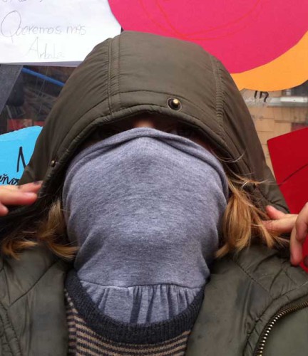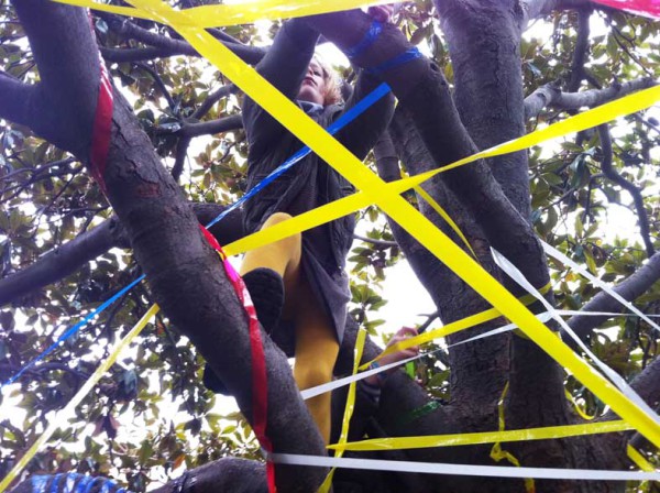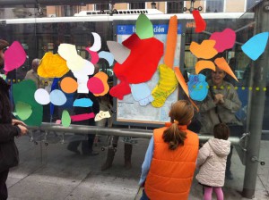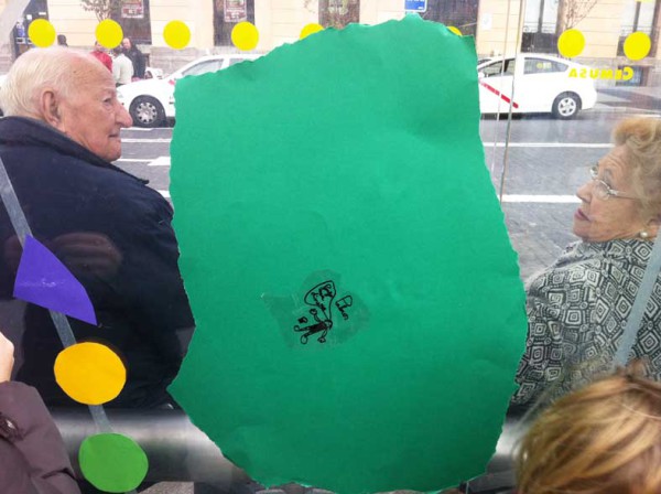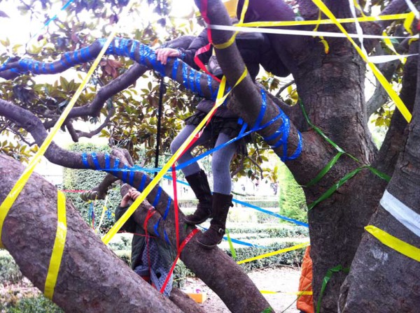 Luego nos hemos ido enfrente del palacio real. Allí, escondidos por la profundidad de los jardines, hemos creado el taller ANTI ÁRBOL DE NAVIDAD. También en señal de protesta contra la tala innecesaria de árboles, hemos tirado diversas cintas de colores entre las ramas de un gigantesco magnolio creando una decoración efímera, preciosa y muuuy barata. Ya era la hora de comer. Celia y Elí nos han regalado con un sabroso arroz, morcillo estofado y tarta de chocolate. Después de jugar y de hablar, hemos vuelto al lugar donde han sucedido nuestros talleres para ver que había ocurrido: mientras que el magnolio permanecía casi intacto, nuestra marquesina había sido intervenida por nuevos artistas que han pegado al cristal un plátano o que han escrito nuevas protestas.