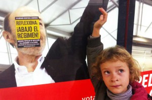 Luego henos cogido el metro y hemos ido comprobando como, además de publicidad, el suburbano está lleno de intervenciones a través de las cuales la gente protesta sobre determinadas cuestiones, como los carteles de Rubalcaba donde su cara desaparece debajo de una pegatina.