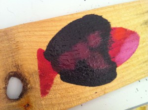 Una vez elegido el tiempo como elemento conceptual del taller, lo siguiente consistió en pensar en cómo representar el cambio con el material del que disponíamos, así que la idea que surgió fue la de pintar las cajas viejas con animales nuevos, animales más bien posmodernos que surgían de la mezcla de calamares con musarras, de erizos con anémonas, de personajes hiperreales con los bichos reales que vemos cuando buceamos. Los tonos también fueron elegidos cuidadosamente: morados y negros en vez de los azules y rojos ya que el color es una buena herramienta para diferenciar dos opuestos.