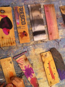 Proceso, creatividad y conocimiento trabajados, en algunas partes del proceso, con las manos y en otras, sin ellas. Manualidades creativas, intelectuales, que nos hacen reflexionar, pensar, que nos hacen tocar, mezclar, elegir con significado, que duran mucho tiempo y que nos dan la oportunidad de descubrir que unas cajas de pescado pueden entenderse como un material super potente que no hace falta comprar, que se convierte en soporte por que nosotras lo decidimos como tal. Arte contemporáneo, cultura visual, producciones infantiles: por que el aprendizaje y la educación también suceden con cajas de pescado.