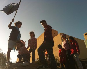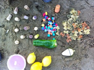 En las últimas vacaciones de semana santa y en el pasado domingo hemos experimentado varias situaciones en las que hemos modificado los tiempos demostrando la potencialidad de la educación expandida. En primer lugar Julieta, Sol, Paz y yo nos fuimos una tarde a la orilla del mar para experimentar qué tal funcionaba el agua salada como soporte. Llevábamos ya varios días preguntándonos qué ocurriría al utilizar un soporte en movimiento en vez de uno estático para transmitir ideas, así que cogimos diferentes materiales y nos fuimos, sin hora de salida ni hora de regreso, hasta el Playazo.Antes de salir, pensamos en los conceptos que queríamos transmitir, Sol eligió el apocalipsis, Julieta la culpa y Paz el concepto perrito. Estuvimos experimentando bastante tiempo con los diferentes materiales que habíamos llevado y que permanecían un segundo tal y como queríamos para desvanecerse rápidamente al ser arrastrados por la corriente. Julieta eligió un limón para representar la culpa, por que la culpa es amarga, y casi sin darnos cuenta se hizo de noche.