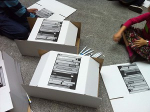 Para terminar, Monseoir Voyage nos invitó a realizar el Taller de Libros Mutantes que se organizaba en Madrid para celebrar el Día de los Libros. El proceso del taller consistió en trabajar con unas cajas de cartón impresas con lomos de libros para generar una librería gigante y repensar que significan los libros en nuestras vidas, esos libros máquina que potencian nuestro conocimiento hasta sus límites.