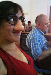 Justo un día antes, en la defensa de los trabajos de fin de master del Máster de Educación Secundaria Obligatoria de la UCM, también lo narrativo se filtró en la sala cuando Noelia Antúnez y los estudiantes presentes, se ataviaron con las diferentes gafas que uno de los estudiantes, Diego Miñambres, nos entregó en una caja. Su trabajo (La Performance como juego y espectáculo a través de la figura de Esther Ferrer una experiencia didáctica adaptada en el aula de 1º de la ESO) conecta con la idea de transformar lo científico en ficción, lo descriptivo con lo narrativo, el suspenso en suspense y con la participación, de manera que volvió explícito el carácter ritual del acto y lo performizó. Fue el tribunal mas divertido y de los que más aprendí de todos lo que estado hasta a fecha.