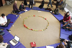 que retiramos las sillas duras, dispusimos colchonetas blandas y repartimos por el suelo los kilos de fruta que habíamos comprado la noche anterior con la intención de crear experiencias frente a simulacros y de convertir lo descriptivo en narrativo. Las participantes agradecieron de inmediato el cambio del formato y comenzó una sesión marcada por el espíritu de cambio. Hiperdesarrollo del lenguaje visual, pedagogía tóxica, rEDUvolution: a través de detonantes verbales se cortocircuitaron nuestras ideas de manera que los rizomas brotaban en casacada. Tras la comida, trabajamos en un escenario diferente en el que un círculo de frutas brotó en el centro de la sala.