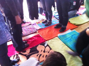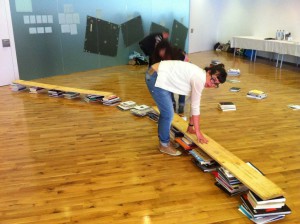Cada participante vino con un kit con tres cosas: dos libros de educación, otro par de libros relacionados con el arte y una toalla playera. Al llegar, se autoidentificaron para luego entrar en la sala, dejarnos lo que habían traído y volver a salir. Con los libros de todos los participantes Yotima, Koldo, Amaia, Betisa y yo forjamos los pilares del puente que construimos allí mismo y que los asistentes tuvieron que atravesar para volver llegar a la sala, un puente construido sobre el conocimiento y que representaba la unión entre esos dos espacios que conviven sin mezclarse.