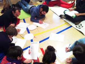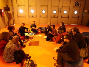 El jueves tuvo lugar la segunda sesión de presentación de proyectos del MESO (Master Educación Secundaria Obligatoria): al abrir la puerta del noaula lo primero que apareció ante mis ojos fue una tienda de campaña!!!. Los proyectos de esta sesión nos hicieron sentir igual de bien que los de la anterior, ya que los estudiantes han integrado todos ellos el arte contemporáneo y arquitecturas disruptivas y estoy segura de que también lo utilizarán cuando sean docentes. El primer proyecto, EDUCAMP, propuso el uso de las dinámicas de campamento para armar la sesión, así que tumbados sobre colchonetas y alumbrados por un fuego virtual, escribimos en un papel lo que no nos gustaba de la educación actual para luego o convertir ese papel en una mariposa o hacerlo desaparecer mediante una máquina trituradora. El segundo proyecto sucedió en medio del campo, deslocalizando por lo tanto las geografías habituales mientras que el tercero y cuarto coincidieron en la utilización de la lana como metáfora del trabajo en red en un caso y como transformación de la asignatura  de Costura (solo podía ser en el colegio Estudio claro) mediante la introducción de lo denominado como Yarnbombing” o “Ganchillo urbano” que renueva en uso de este tipo de técnicas al descontextualizarlas. La mayoría de estos proyectos han sido creados y presentados en grupo y también tengo que decir, que las calificaciones a las que llegó cada estudiante sobre su proceso de aprendizaje, fueron consensuadas entre todos demostrando una vez más la eficacia del trabajo en red.