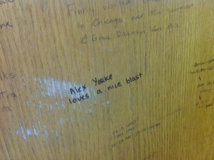 Estoy en la biblioteca/starbucks donde he quedado con Felipe a las 9 de la mañana. Felipe el año pasado hizo un trabajo sobre los grafitis que los estudiantes perpetran en las paredes de las mesas de madera del sótano de la biblioteca principal. Los grafitis son obscenos, hacen muchas referencias a los genitales de ambos sexos pero siempre utilizando lo femenino como peyorativo. Felipe estableció cinco categorías con respecto a estos grafitis: