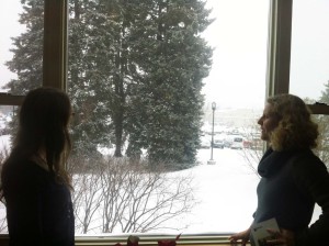 Andrea y yo hemos vuelto a encontrarnos para proseguir nuestra conversación y avanzar hasta el tema número dos mediante el que quiero indagar si Colby es un territorioo un no lugar y de nuevo lo hemos hecho en la biblioteca del edificio de Artes mientras la nieve caía sin cesar….Coincidir con gente interesante es una suerte que no se tiene todos los días y la verdad es que Andrea es muy interesante. De entre todas las cosas que hemos estado hablando me han llamado la atención sobre todo una: la idea de que la arquitectura es Colby es una asesina del conocimiento. Me explico.