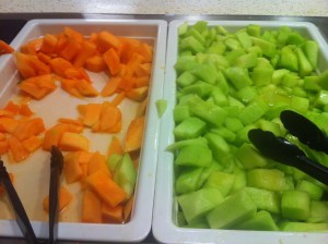 La comida es algo muy importante para mi, y no solo desde el punto de vista biológico, sino como elemento de celebratorio que nos conduce a la conexión intelectual con otras personas, así que hoy he decidido investigar qué se desayuna en Colby y he descubierto que la fruta (eso si cortada) tiene un lugar privilegiado en la primera comida que hacen los estudiantes. Muchos de ellos desayunan en grupos pero también muchos lo hacen solos, leyendo el periódico en papel o en el ordenador junto con enormes vasos de un café humeante al que no hace falta ponerle ni leche. A las nueve el comedor se queda prácticamente vacío, nadie se queda a charlar ni a pasar el rato.