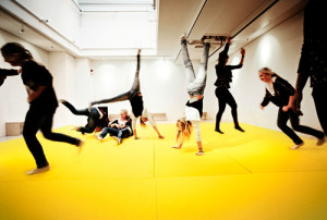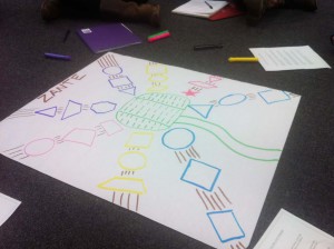 En un momento determinado, Mark pide a los asitentes que se organicen en tres grandes grupos y marca cada uno con chapas de diferentes colores. Los estudiantes se sientan en el suelo y en el sofá. Comienza una dinámica en que cada grupo tiene que diseñar una comunidad en la que un tipo determinado de cultura ha de desarrollarse. Pero en un momento dado, Mark avisa que ha tenido lugar un desastre natural y que determinados miembros de cada cultura ha de mezclarse con los de otra. Empiezan a diferenciarse los que están dentro y fuera de cada cultura y entiendo que la dinámica tiene que ver con los usos del poder entre los que crean una comunidad y los que pretender acceder a ella.