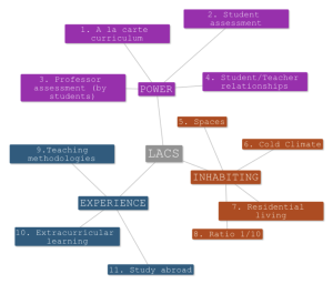 Con respecto a las relaciones de podernos hemos preguntado: ¿qué beneficios aporta para el aprendizaje la posibilidad de poder elegir libremente las asignaturas? ¿Cómo son evaluados los estudiantes en los LAC y qué opinan al respecto? ¿Cómo son evaluados los profesores por los estudiantes? y ¿Cómo son de estrechas las relaciones entre ambos? Con respecto al territorio nos hemos hecho las siguientes preguntas: ¿cómo son los espacios de Colby College y como afectan al aprendizaje? ¿Cómo afecta el clima? ¿Qué beneficios o perjuicios aporta al aprendizaje vivir en el campus y el estilo de vida del residencial? ¿Qué provecho aporta estudiar cuatro años una comunidad tan pequeña con una ratio profesor estudiante de 1/10? Y con respecto a la experiencia: ¿qué metodologías utilizan los profesores para impartir sus clases en los LAC y como afectan al aprendizaje? ¿Dónde aprenden más los estudiantes en el aula o fuera de ella? y ¿Qué beneficios aporta para el aprendizaje la posibilidad de pasar un año académico en un país distinto al donde el estudiante reside?