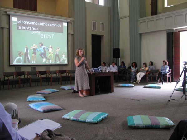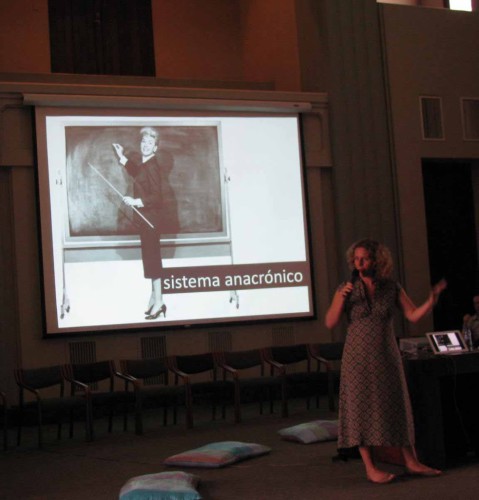 El primer día, tras ser recibida por Fanny Angulo por parte de la universidad y por Ana Piedad Jaramillo, Piedad Posada y Conrado Uirbe (Directora General, Directora del Departamento de Educación y Curador Jefe del Museo de Antioquia) y otros conocidos como Margarita Pineda, en una sala casi repleta y des-organizada en círculo, tocamos el tema del posmuseo desde la perspectiva de las educadoras bajo el título Soy educadora en un museo…..¿Cómo llevo la teoría a la práctica? Hablamos de la necesidad de convertir el museo marketiniano en el posmuseo a través de, entre otras cosas, metodologías de trabajo contemporáneas: el edupunk, las pedagogías regenerativas y el método placenta. Todos estos métodos crearon una gran expectativa así como aceptación demostrando el talante abierto y motivado de la audiencia.