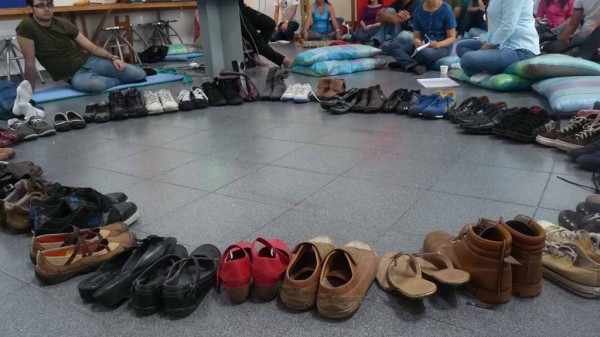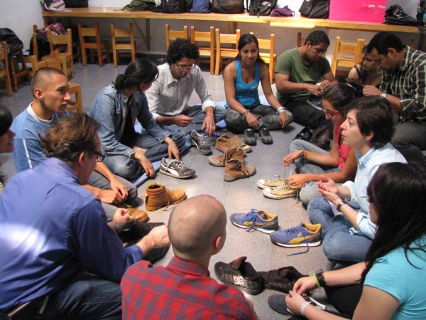 El tercer día tuvo lugar el taller ¿Artista, educadora o productora cultural? de cuatro horas de duración donde el posmuseo se concretó desde la posición de los futuros educadores de museos, es decir, las y los estudiantes de las facultades de Bellas Artes, Educación e Historia del Ate muchos de los cuales vinieron con Bernardo Bustamante, profesor de la facultad de Bellas Artes. La sala Creativa del Museo de Antioquia se llenó de participantes descalzos que se tumbaron por el suelo en una suerte de clase de preparación al parto… Iniciamos el taller creando una producción cultural entre todos tomando nuestros zapatos como material y reflexionando y representando varios conceptos: educadora, artista, pedagogías tóxicas, pedagogías contemporáneas y edupunk.