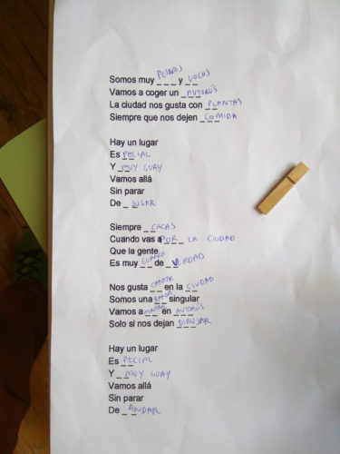 Se apaga la luz y se enciende la pizarra electrónica. Paz busca un nombre en YouTube y lo activa. Una voz susurra: «Luces, cámara, canción» y, acto seguido, una mano presiona un papel celofán, causando ese ruido tan característico que todos hemos producido en clase alguna vez.